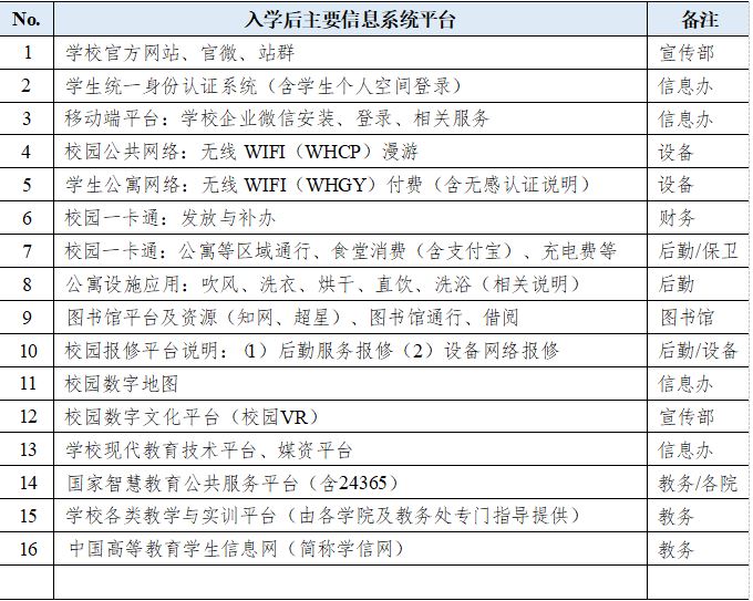 为了让大家便捷应用学校数字校园各类服务,现将大家入学后将要使用的部分主要平台及网络信息系统说明罗列如下,请大家参考使用,如遇相关问题,大家还可通过电话或加群方式咨询。